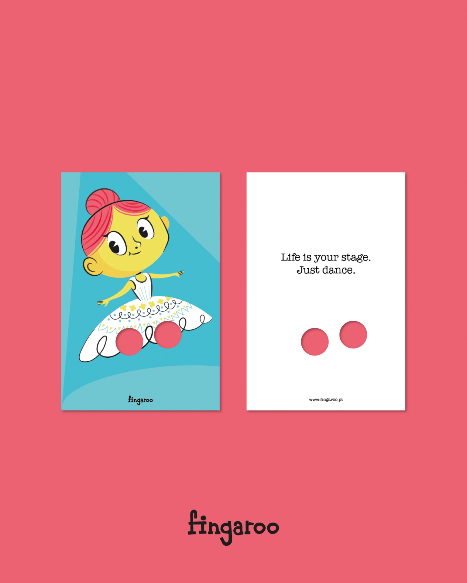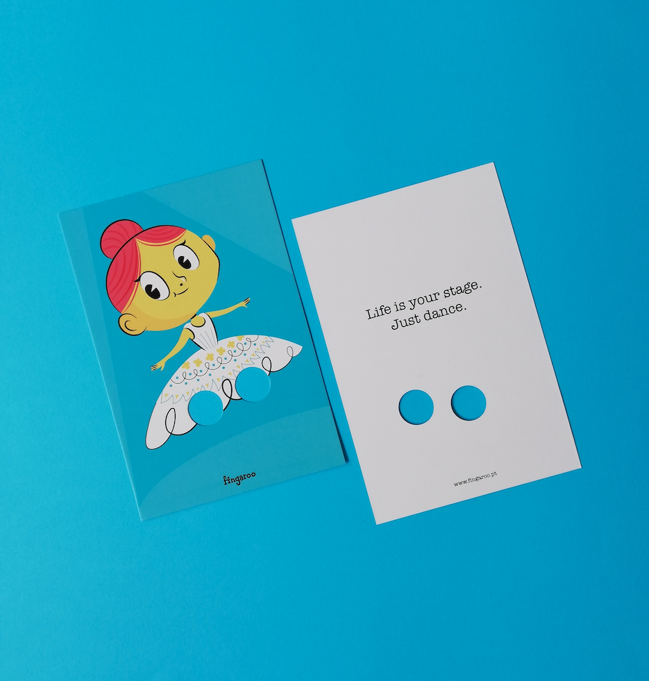 Fingaroo é uma uma série de postais-interactivos que incentivam à brincadeira, seja de crianças ou de adultos. Com um formato não convencional de 12x18cm e um furo peculiar, são postais com uma paleta de cores destinta, mas homogénea entre as suas 12 temáticas, no seu verso contém uma frase de cariz divertido, que apela à identificação das pessoas conforme o seu estado de espírito ou ocasião.