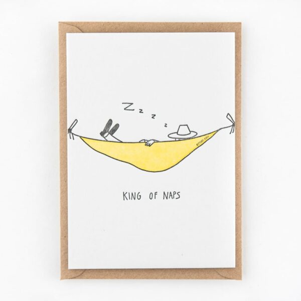 • Cartão branco com desenho a preto e amarelo de pessoa a dormir numa rede, texto KING OF NAPS