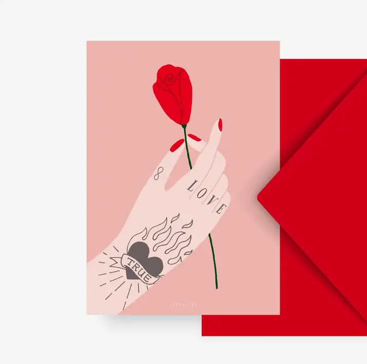 Ilustração de mão tatuada segurando rosa vermelha com envelope vermelho