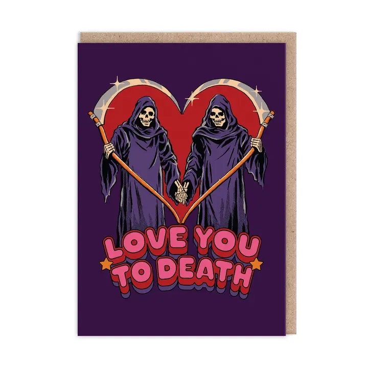 • Cartão roxo com esqueletos segurando foices e coração vermelho, texto LOVE YOU TO DEATH