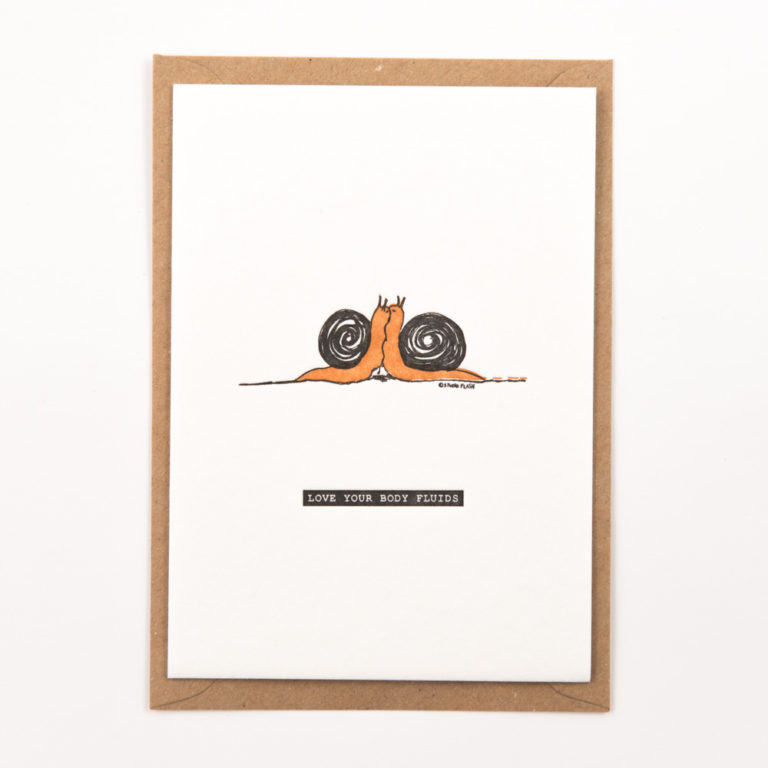 • Cartão postal com ilustração de dois caracóis e texto love your body fluids