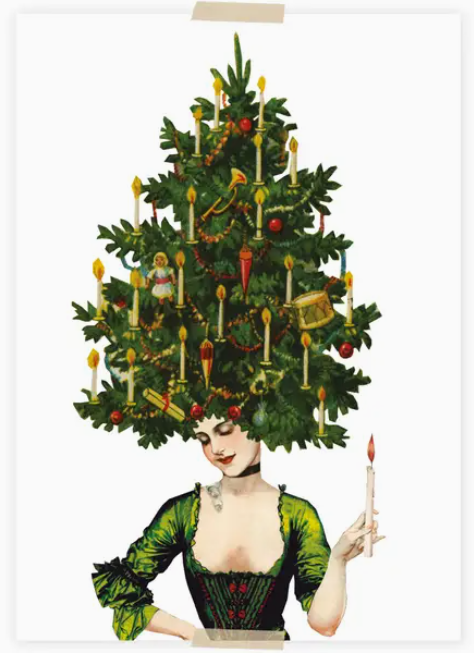 • Mulher com traje verde e árvore de Natal decorativa na cabeça segurando uma vela acesa.