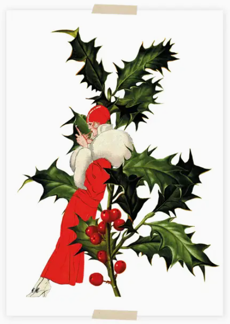 • Mulher com casaco branco e saia vermelha ao lado de um ramo de azevinho
