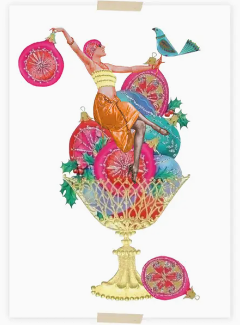 • Ilustração de taça dourada com bolas de Natal coloridas e mulher sentada segurando uma bola, com pássaro azul