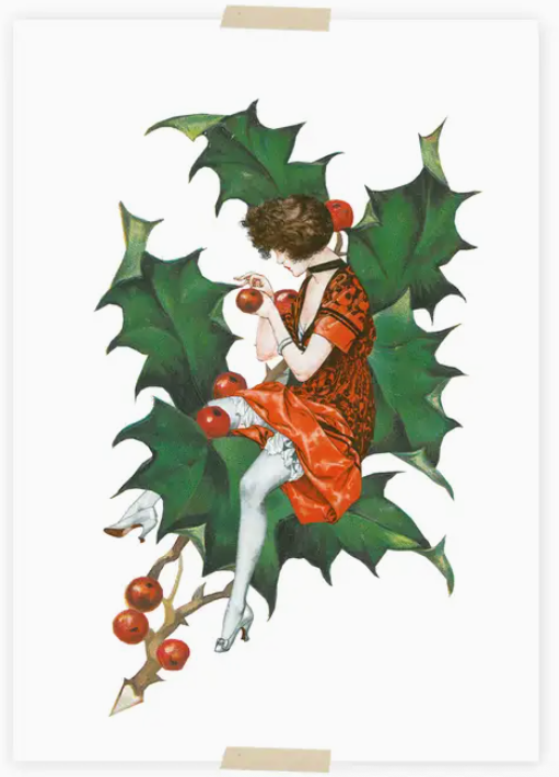 • Ilustração vintage de mulher com vestido vermelho entre folhas verdes e bagas vermelhas de azevinho.