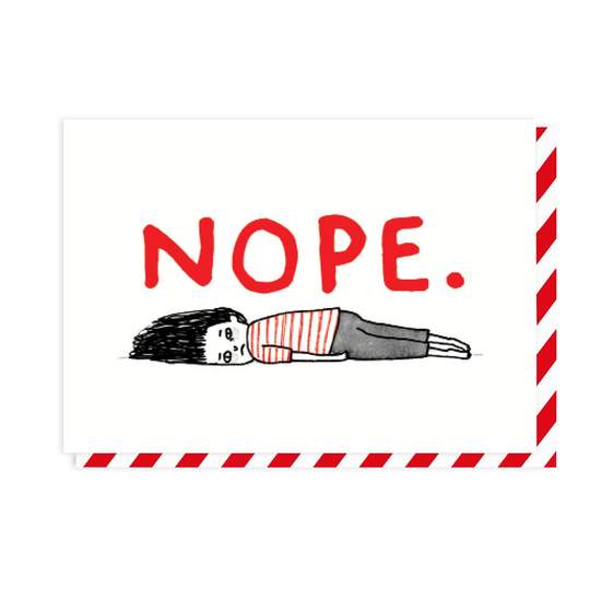 Cartão branco com bordas vermelhas, ilustração de pessoa deitada e texto NOPE.