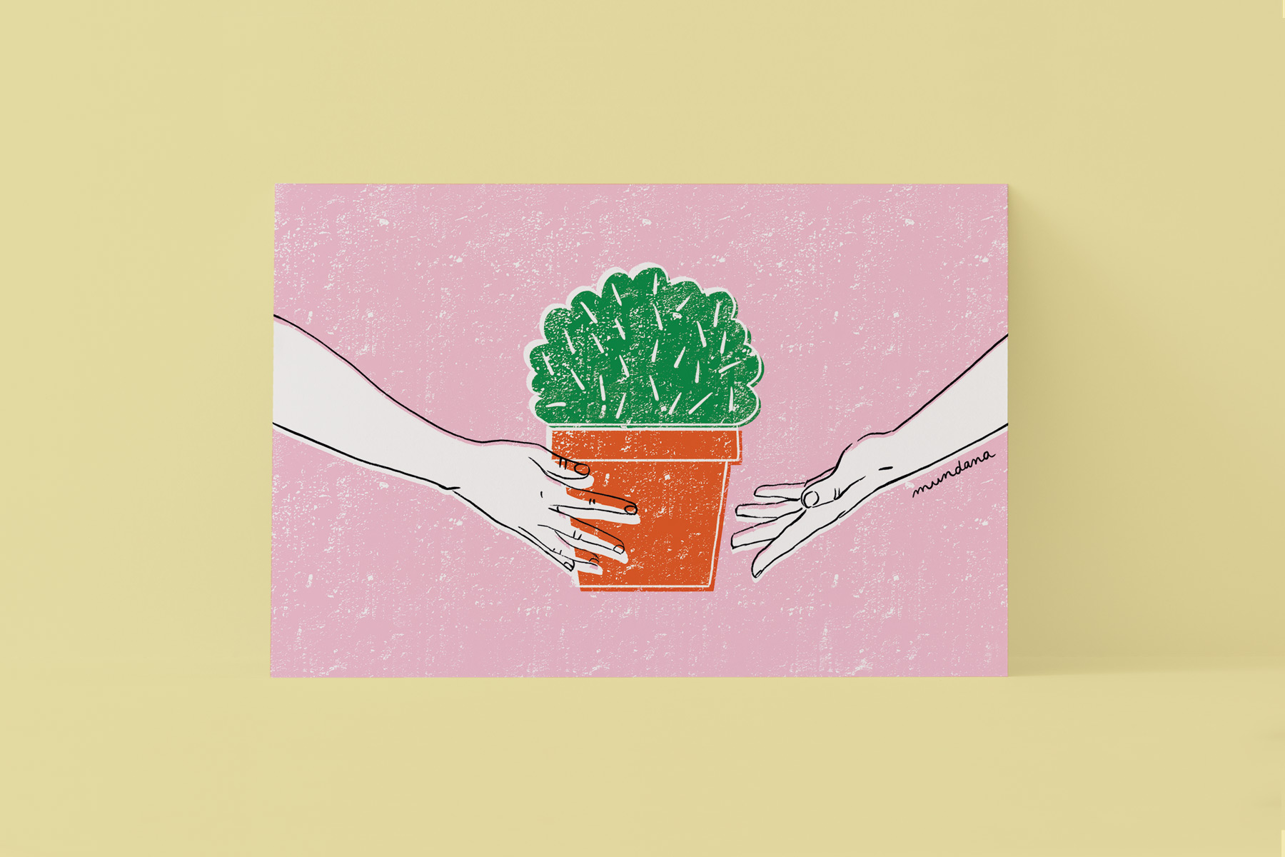• Ilustração mãos segurando vaso com planta verde sobre fundo rosa.