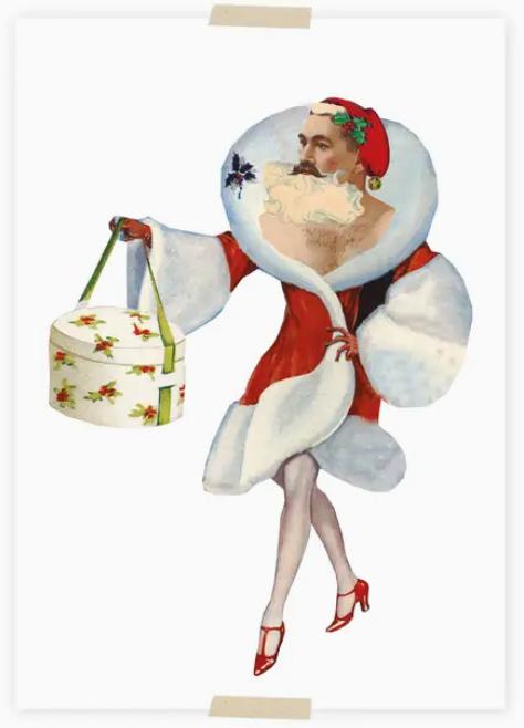 Figura vintage com corpo feminino em casaco vermelho e barba masculina segurando saco com padrão de azevinho