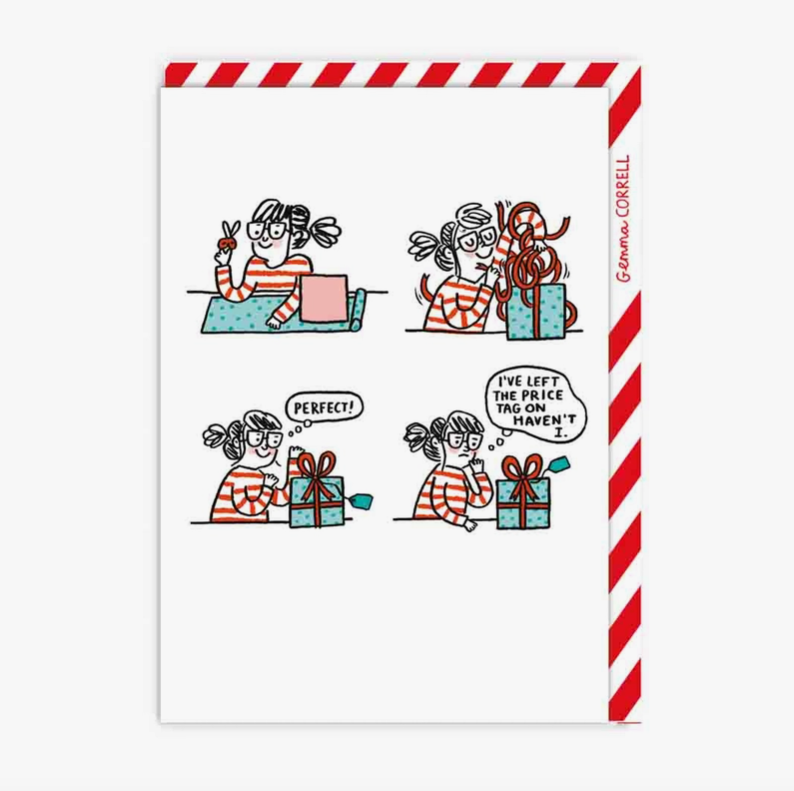 • Cartão ilustrado com mulher a embrulhar presente e texto em inglês sobre preço