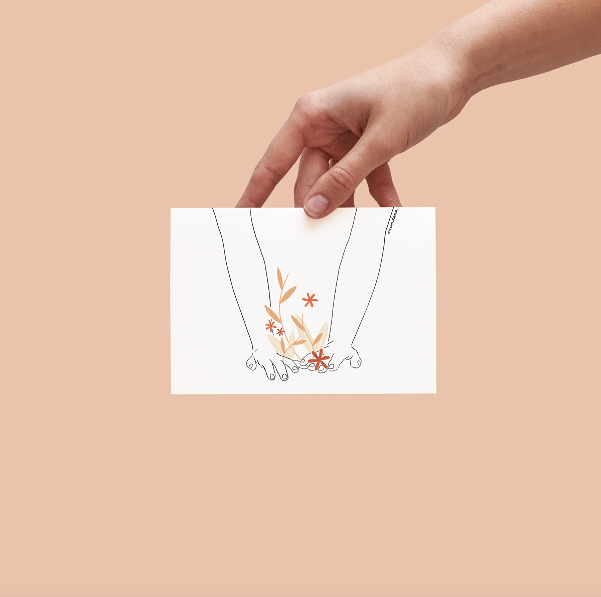 • Postal branco com ilustração minimalista de mãos entrelaçadas e flores em tons de laranja