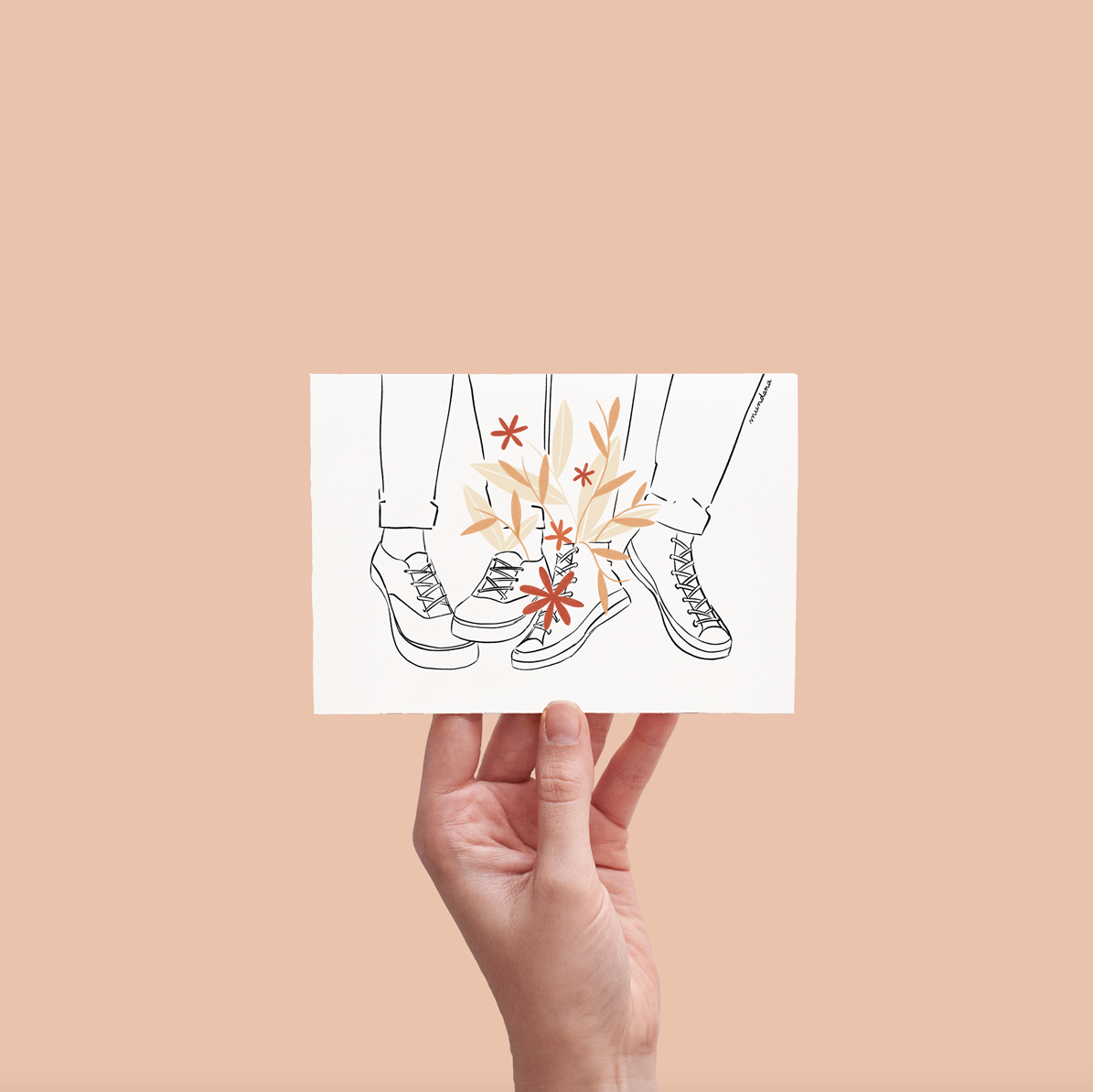 • Desenho de ténis com flores em fundo bege segurado por mão