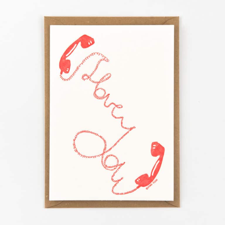 • Cartão postal com desenho vermelho de dois telefones e texto formado pelos fios