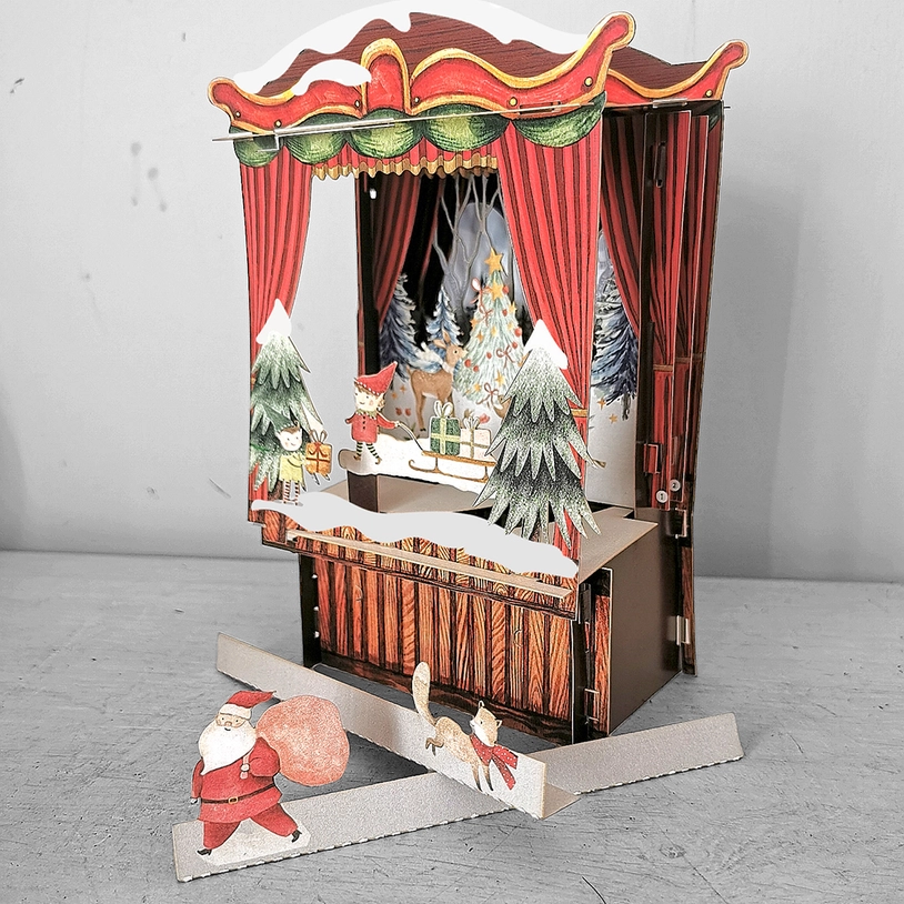 Um pequeno teatro de papel aparece quando se abre o postal, revelando uma cena de Natal com dois personagens móveis, permitindo criar pequenas histórias.