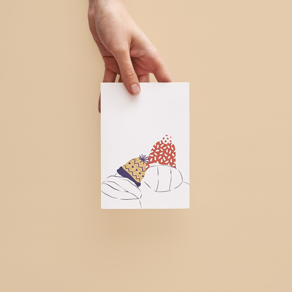 • Cartão branco com ilustração colorida abstrata segurado por uma mão sobre fundo bege