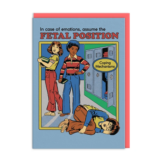 • Cartão com ilustração de crianças junto a cacifos e texto sobre posição fetal