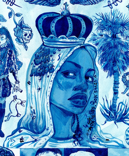 • Desenho azul de mulher com coroa rodeada de outros desenhos e textos