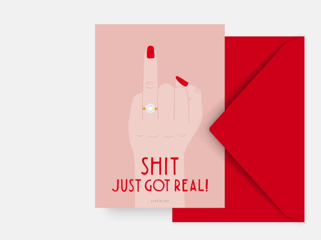 Cartão rosa com mão a mostrar dedo do meio, texto SHIT JUST GOT REAL!, e envelope vermelho