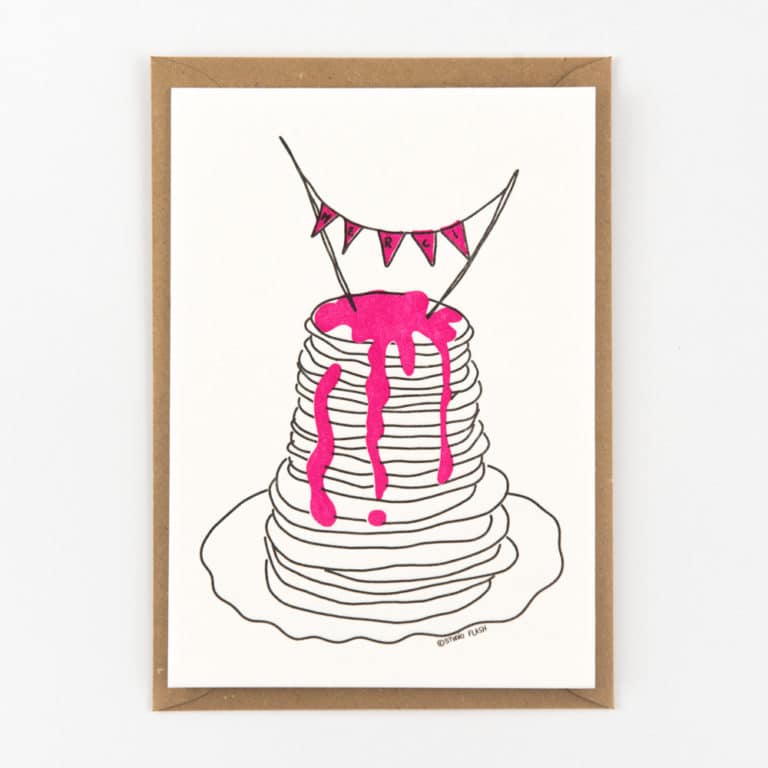 • Cartão ilustrado com desenho a traço de panquecas e bandeirolas rosas.
