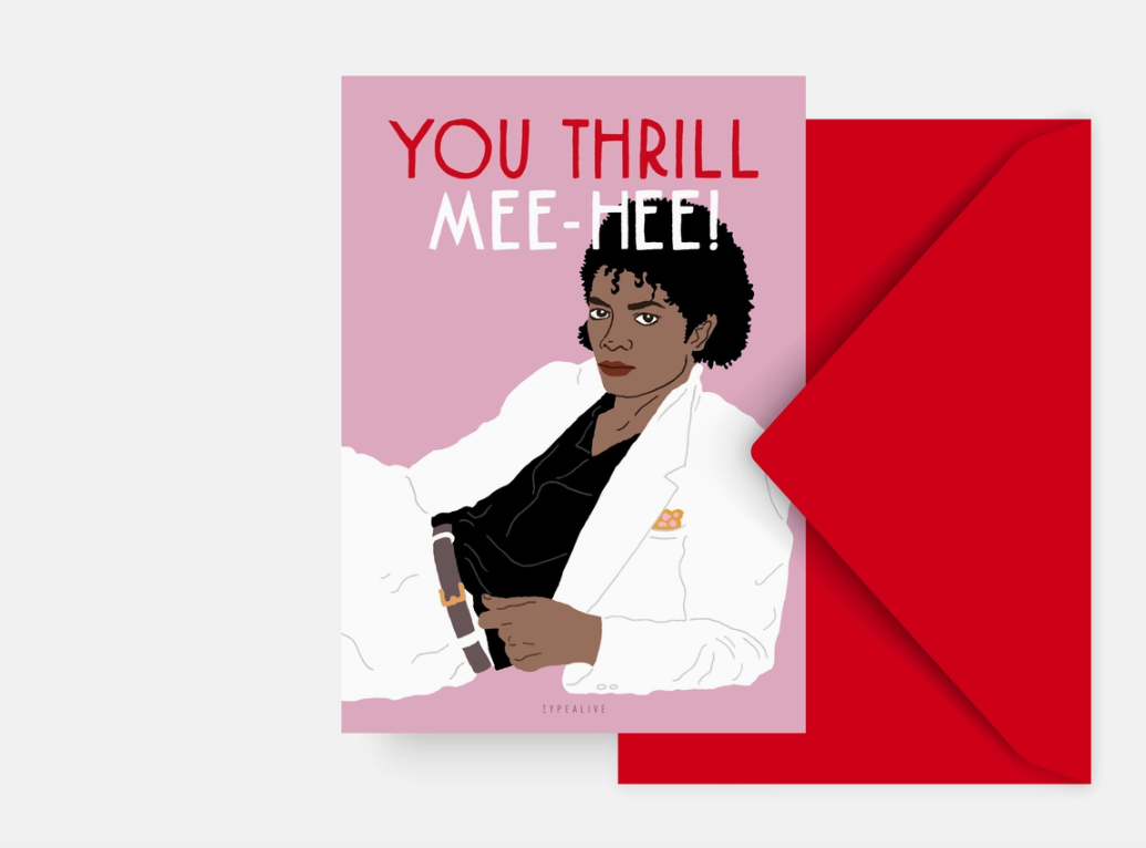 • Cartão com ilustração de homem em fato branco, texto 'YOU THRILL MEE-HEE!' e envelope vermelho