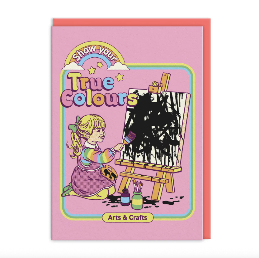 • Cartão rosa com ilustração de criança a pintar numa tela e texto motivacional colorido