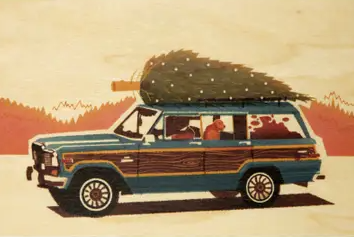 • Veículo SUV clássico azul com padrão de madeira e árvore de Natal no tejadilho em fundo laranja.