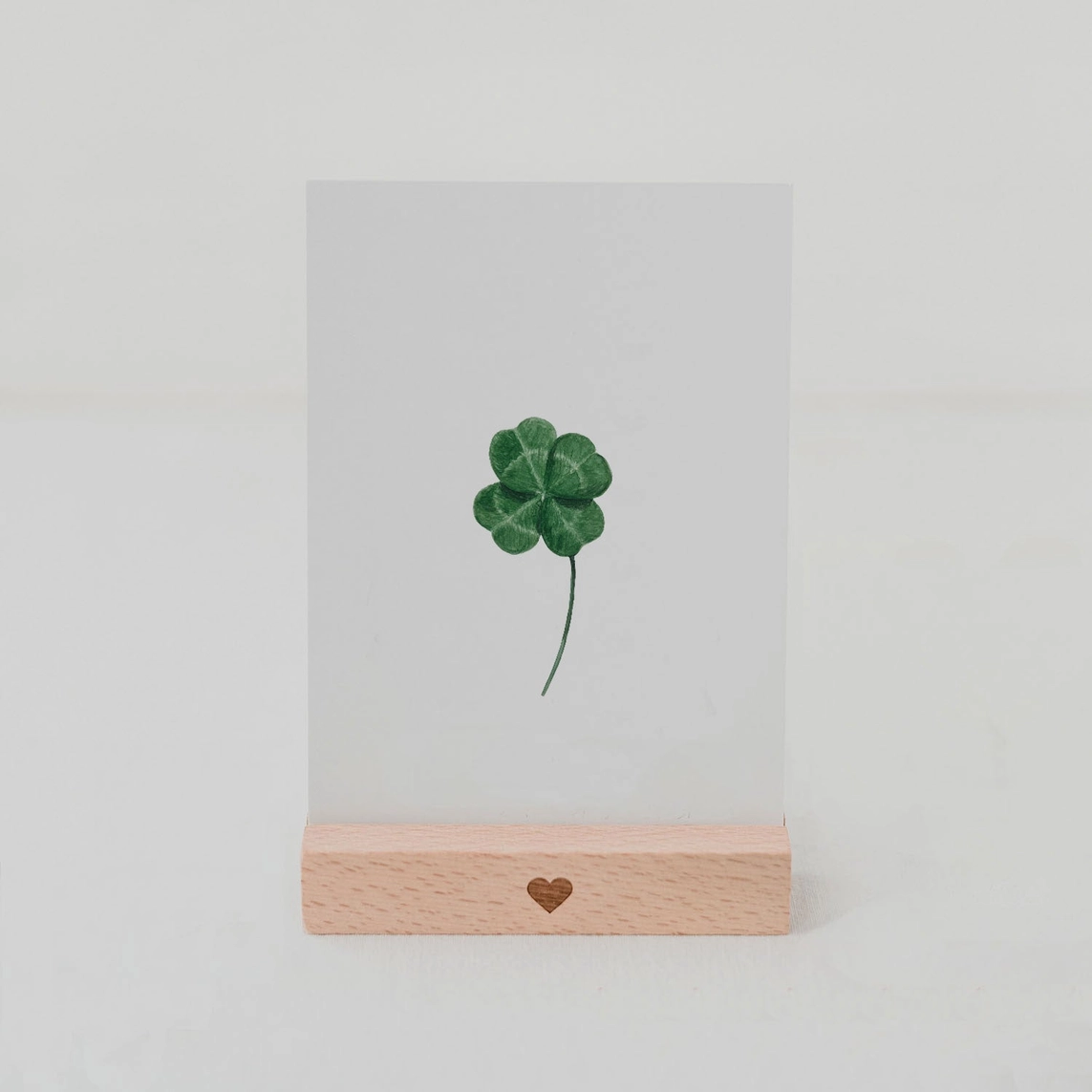• Cartão com ilustração de trevo de quatro folhas em suporte de madeira com coração