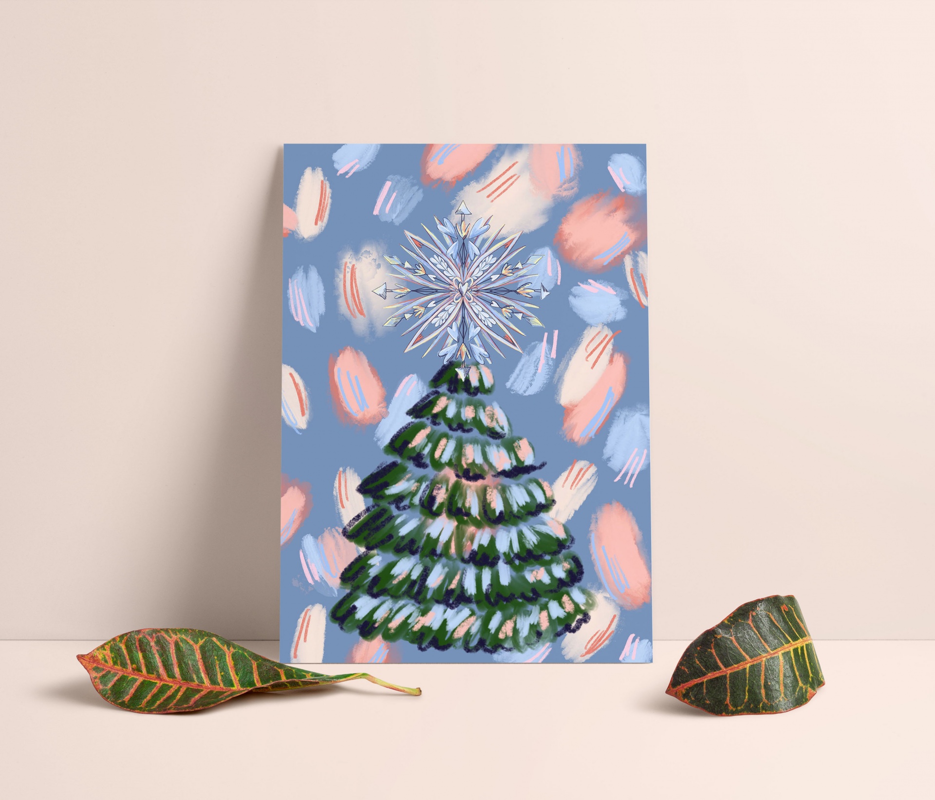 Cartão de Natal com árvore verde e estrelas, fundo azul com manchas coloridas, sobre superfície clara com folhas secas