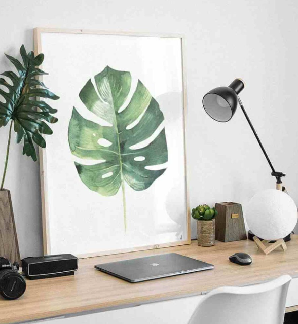 • Secretária de madeira com laptop, candeeiro, quadro de folha verde e planta