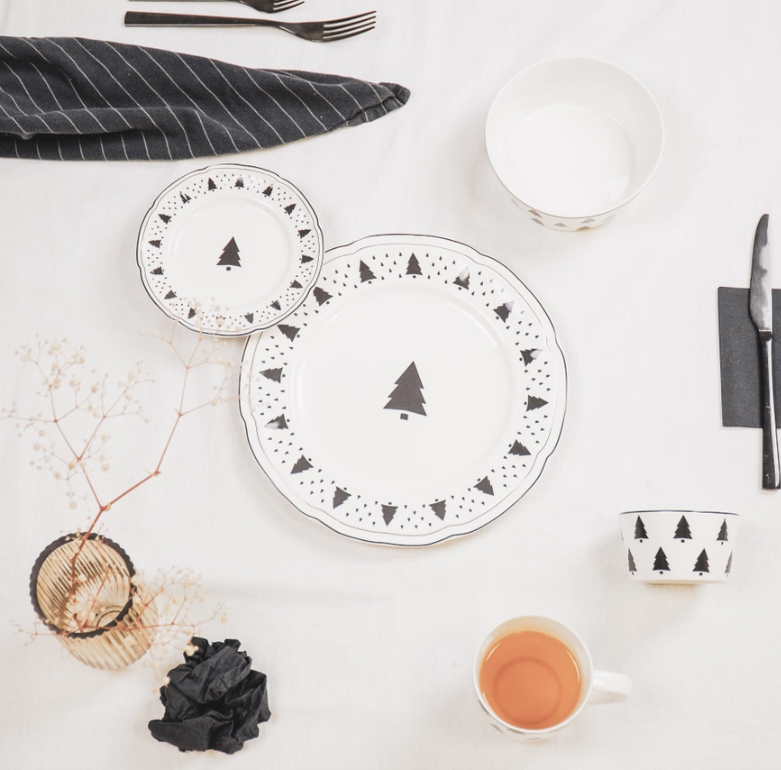 • Conjunto de loiça branca com padrão de árvores pretas sobre mesa com toalha branca