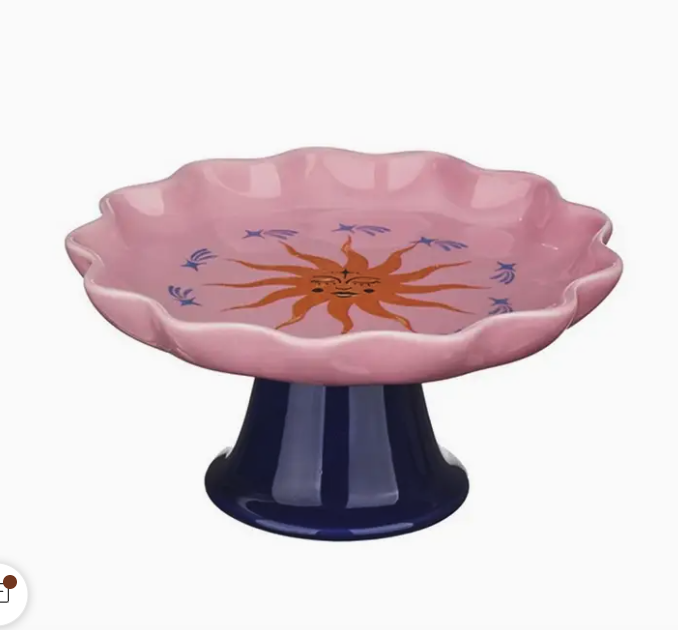• Prato de cerâmica rosa com sol laranja desenhado e base azul escura