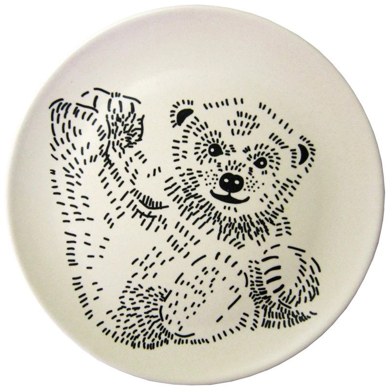 • Prato redondo branco com desenho preto de urso polar estilizado em cerâmica