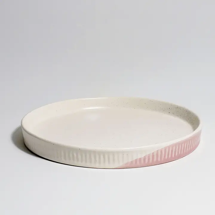 • Prato redondo em cerâmica branco com borda texturizada rosa e branca