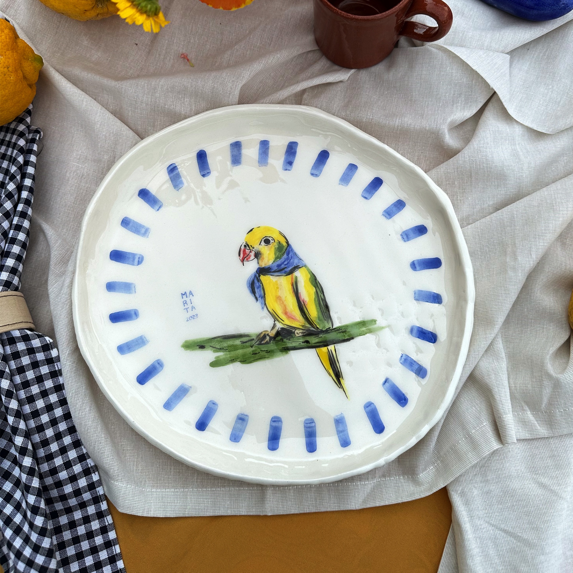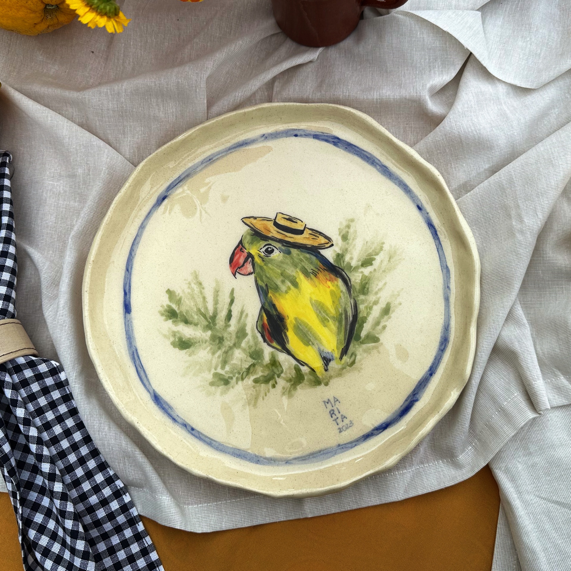 • Prato de cerâmica branca com papagaio pintado e borda decorada a azul