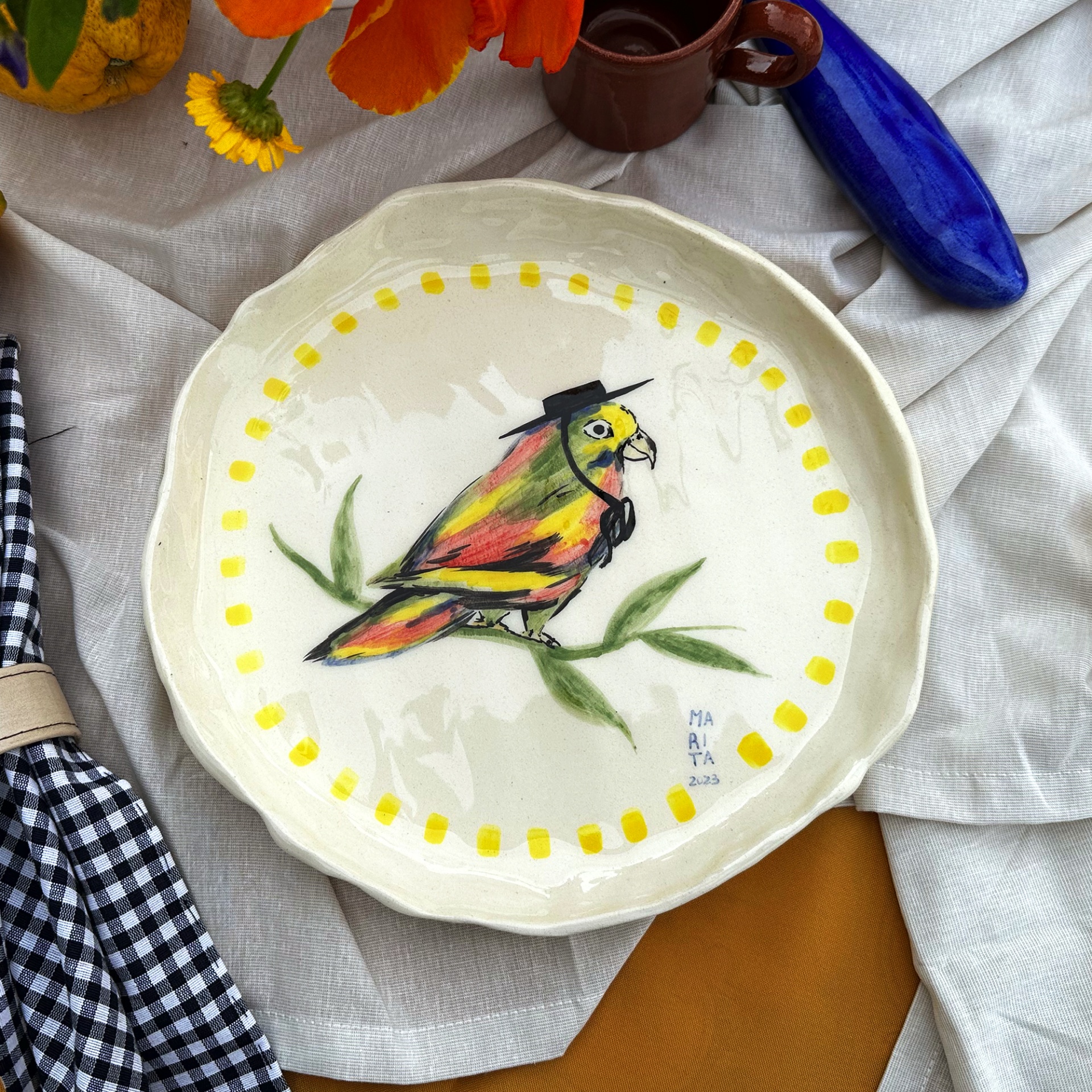 • Prato de cerâmica com desenho de pássaro colorido e pontos amarelos