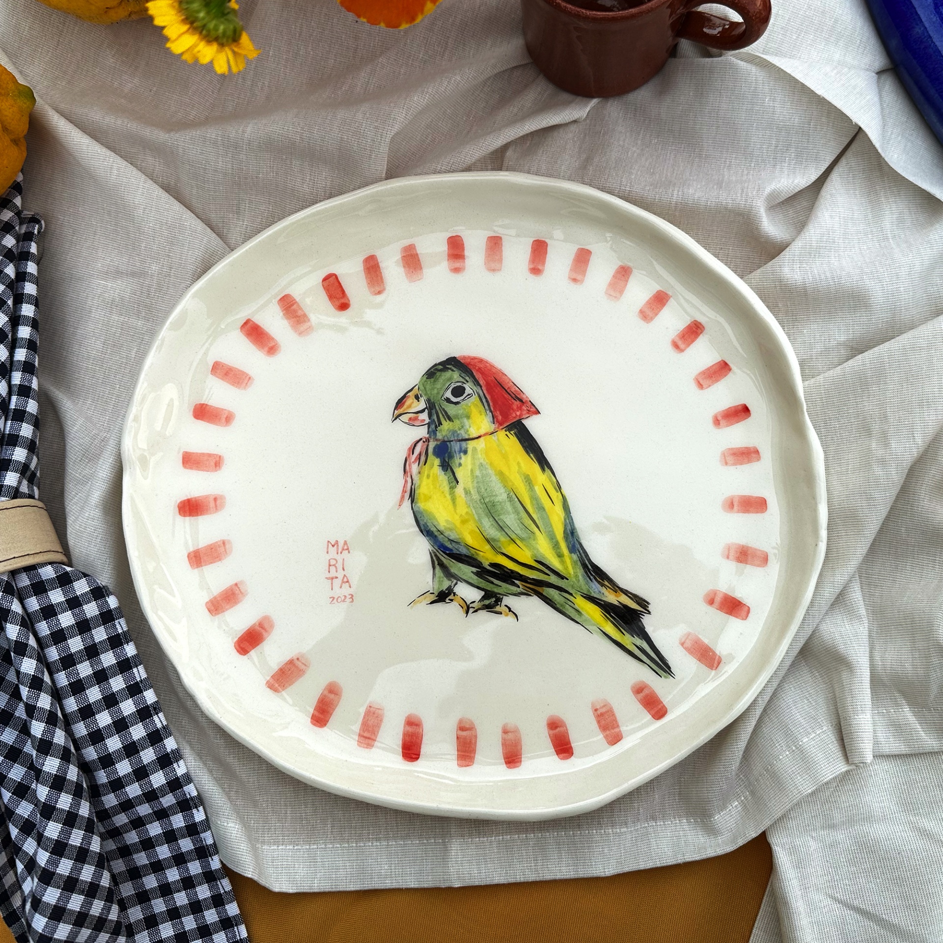 • Prato cerâmico branco com pássaro colorido e riscos vermelhos no bordo