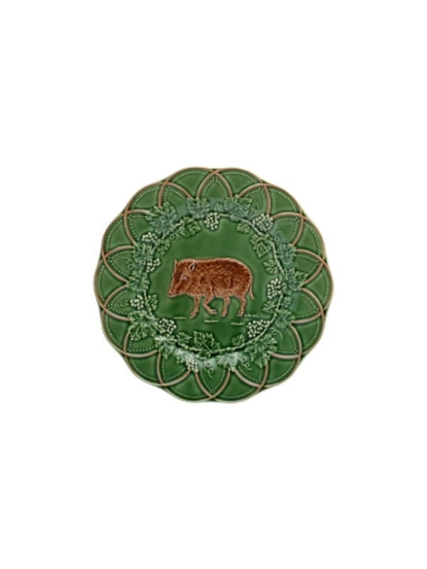 • Prato decorativo verde em cerâmica com javali em relevo no centro