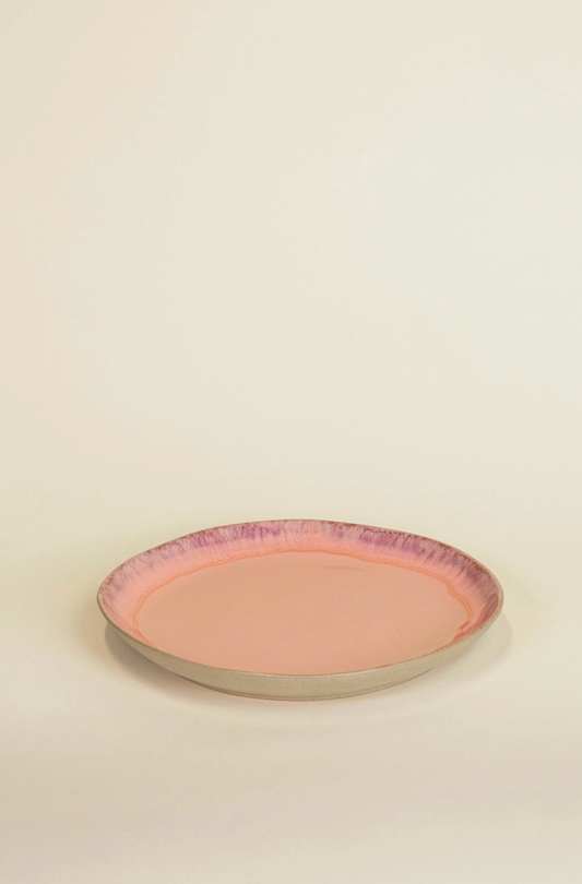 • Prato de cerâmica rosa com borda lilás num fundo claro