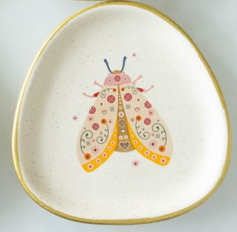 Cada peça tem formato orgânico, decoração com desenhos florais de insetos, acabamento cerâmico salpicado e borda dourada, oferecendo um toque lúdico e funcional para sua decoração.
