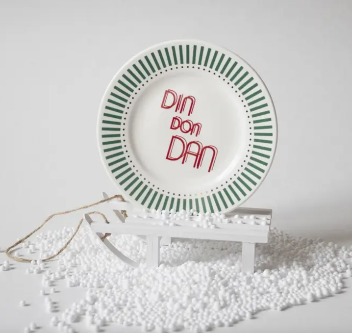 • Prato branco com padrão verde e texto vermelho DIN DON DAN, trenó branco e bolinhas brancas simulando neve