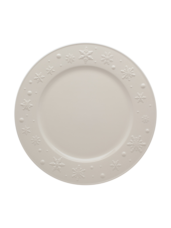 • Prato branco decorado com flocos de neve em relevo.