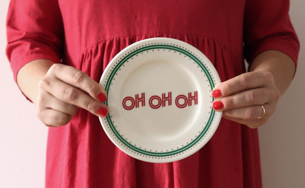 • Prato branco com texto OH OH OH em vermelho segurado por mãos femininas com vestido vermelho