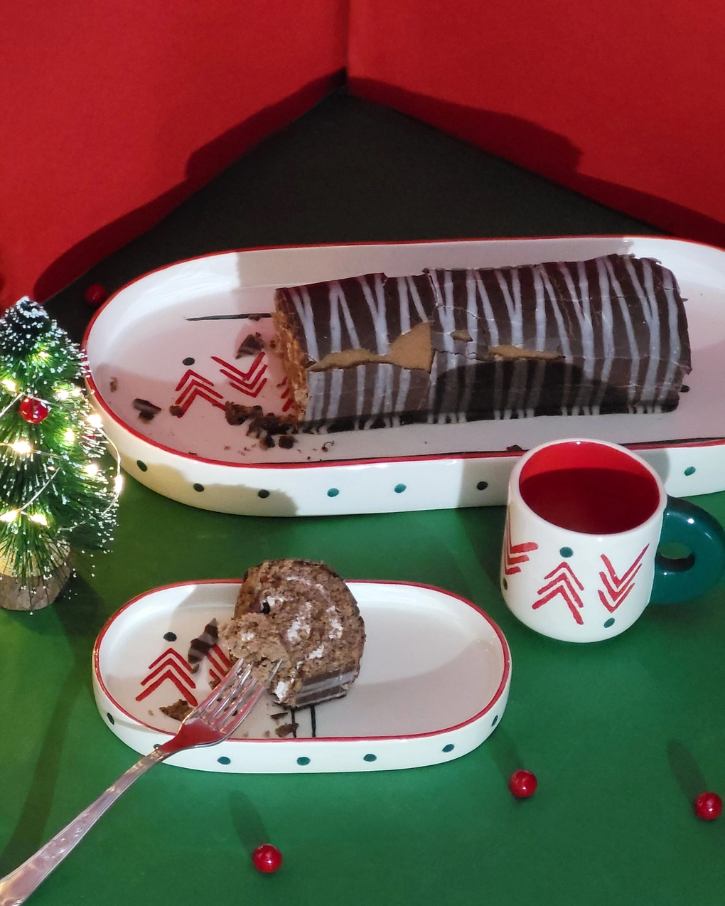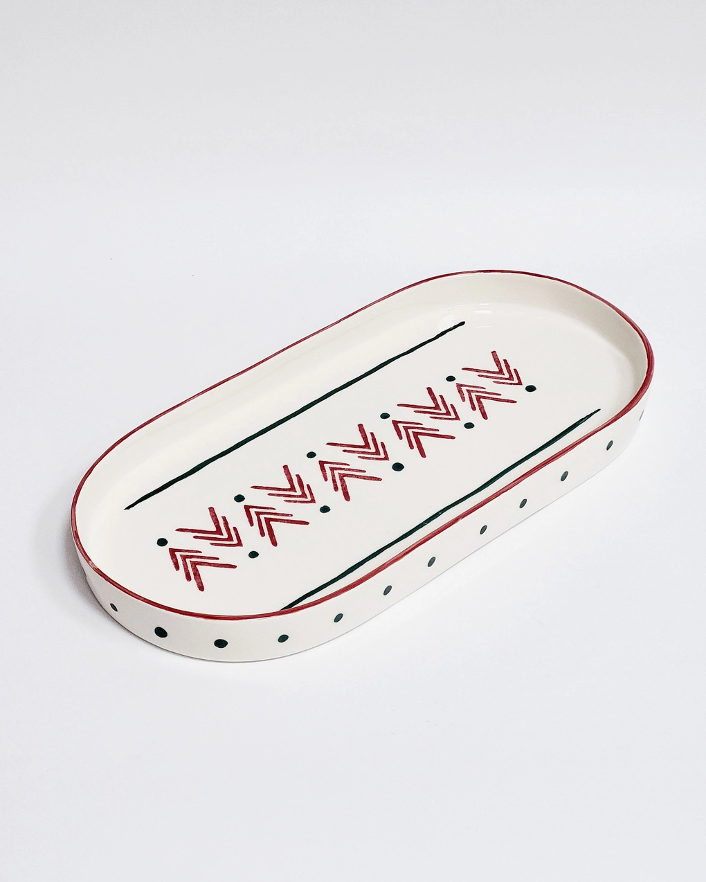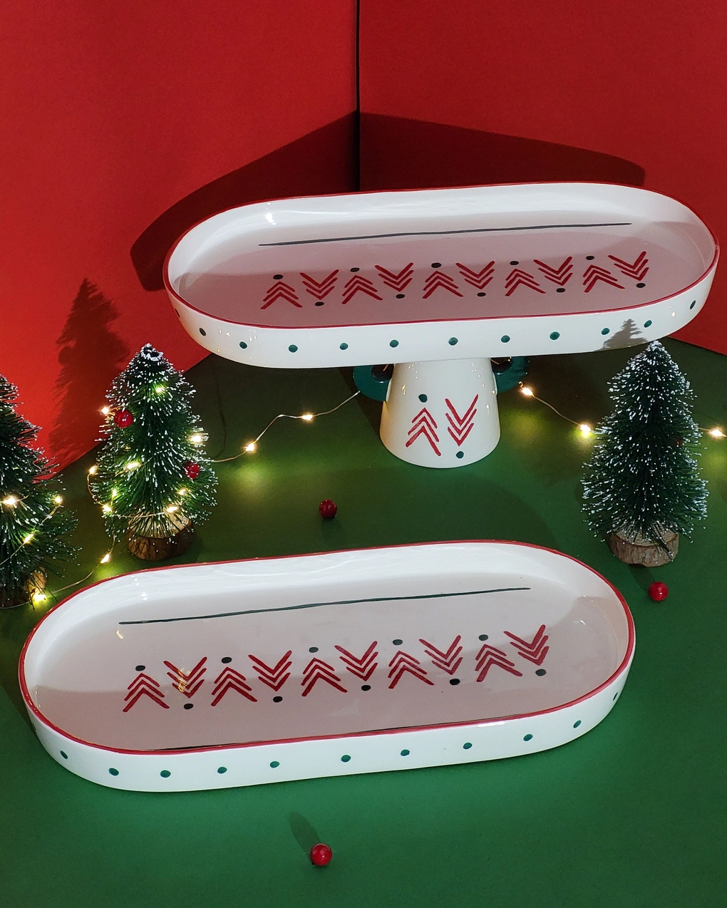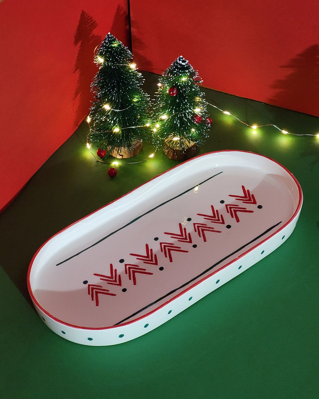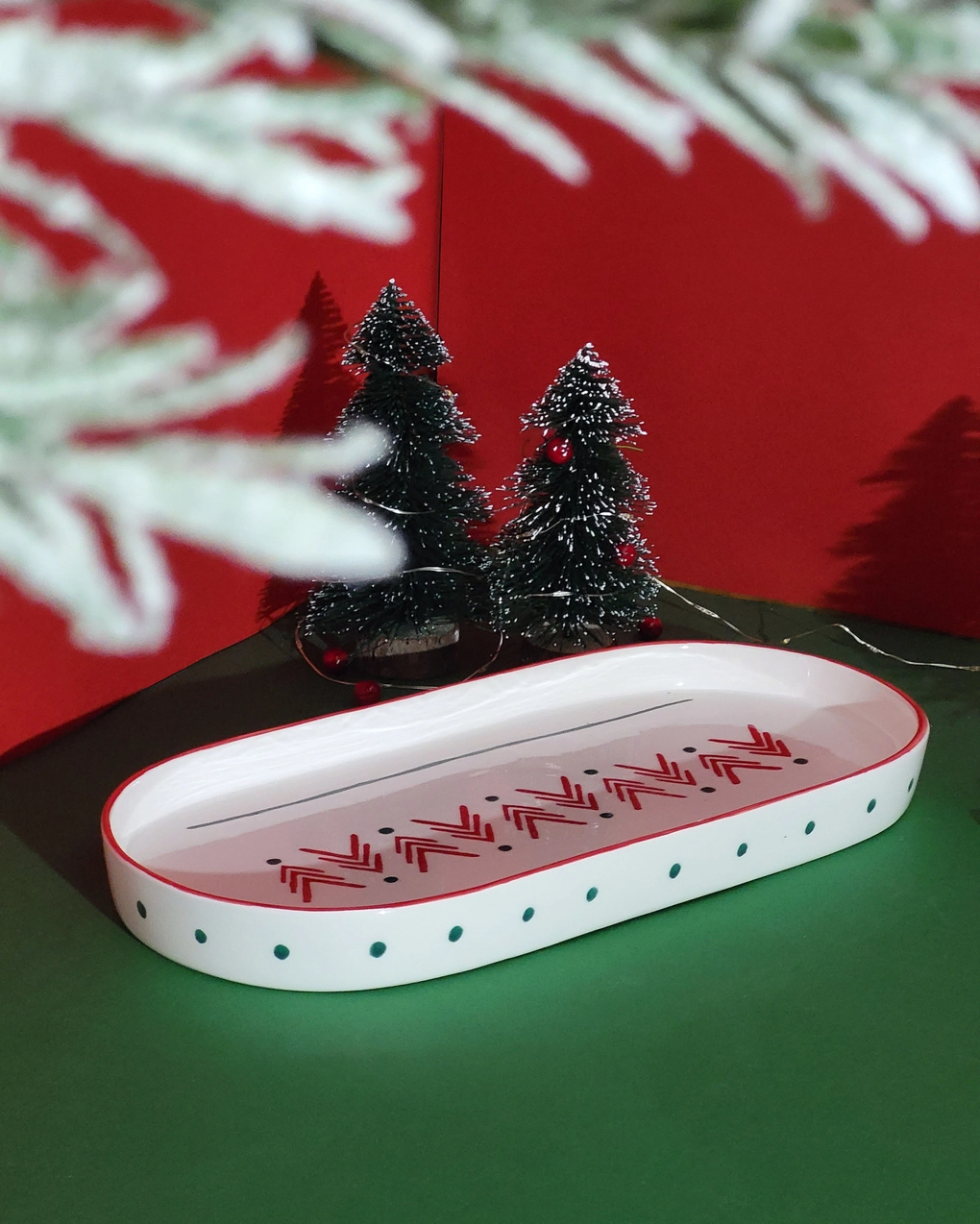 Mostre as suas guloseimas de férias em grande estilo com o nosso Prato Oval da Floresta de Natal. As cores ricas e o intrincado motivo florestal tornam os seus aperitivos e sobremesas ainda mais tentadores. Abrace o espírito da estação com a nossa Coleção Floresta de Natal e transforme a sua casa num país das maravilhas do inverno. Esta coleção é desenhada em vermelho carmesim rico e o verde mais vibrante, evocando o espírito festivo e a beleza exuberante de uma floresta enfeitado com esplendor de Natal. Todas as peças “Pó de Barro” são únicas. Devido à produção artesanal todos os produtos apresentam variações de formas, cores e acabamentos.