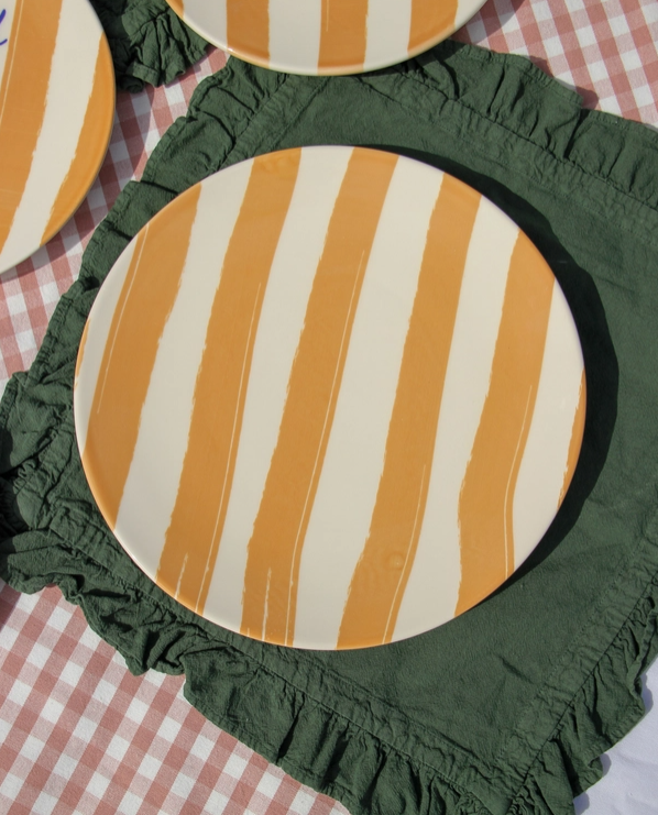 • Prato de cerâmica com listras alaranjadas sobre fundo branco em toalha verde com babados e toalha xadrez rosa e branco