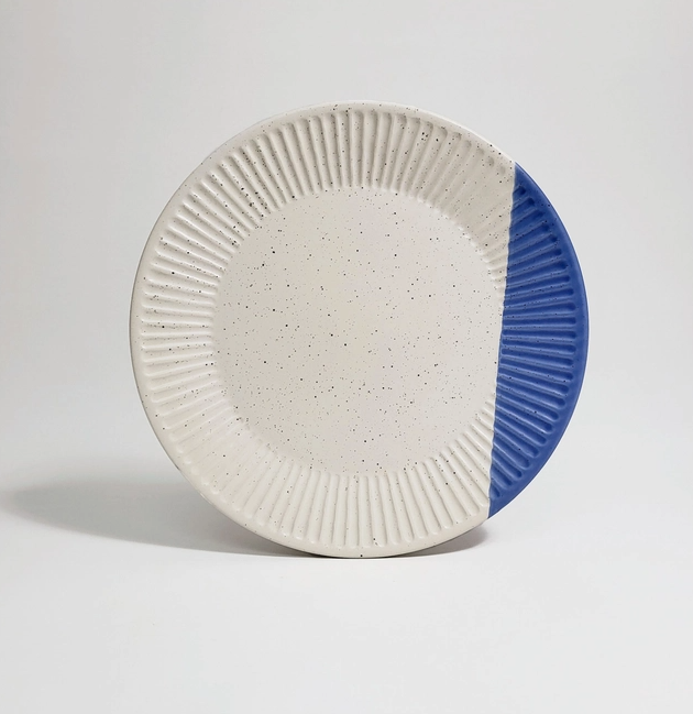 • Prato cerâmico redondo branco com manchas e parte azul texturada.