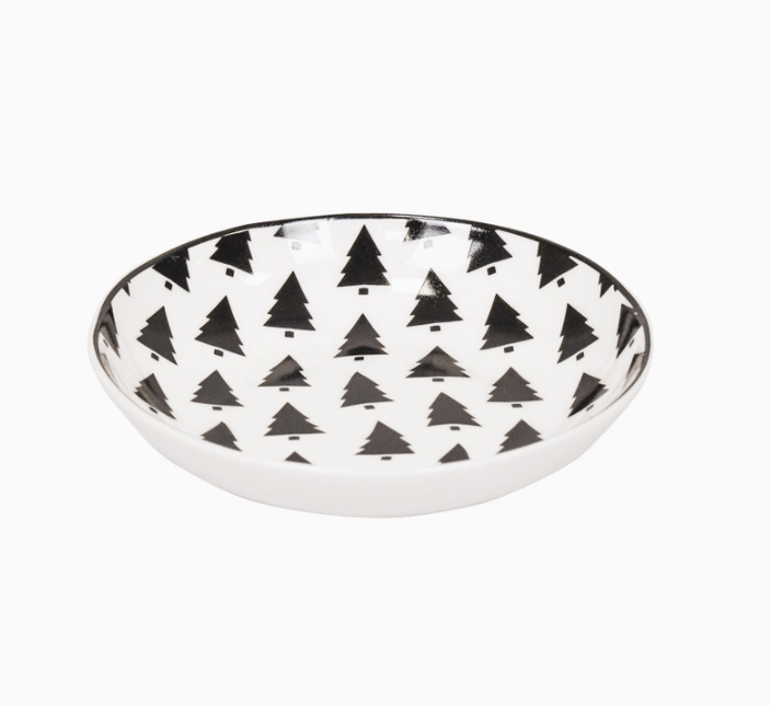 • Prato branco com padrão de árvores de Natal pretas