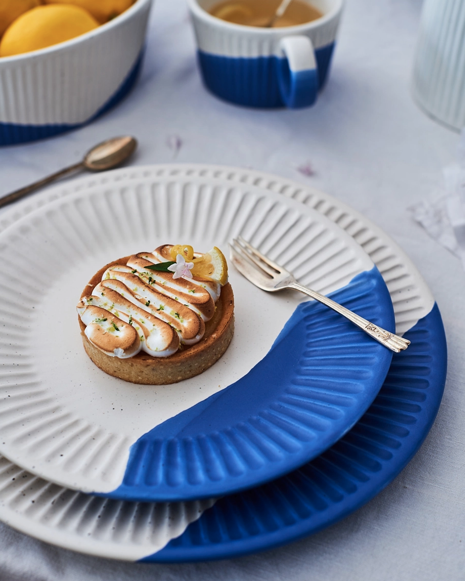 • Sobremesa de tarte de limão com merengue tostado num prato branco sobre guardanapo azul e prato azul, com chávena de café e limões no fundo.