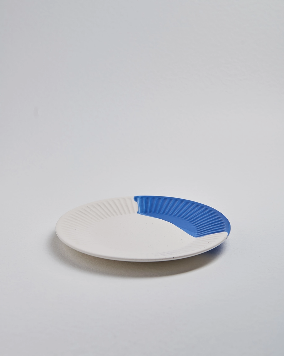 • Prato raso branco com uma seção azul com relevo sobre fundo cinzento claro