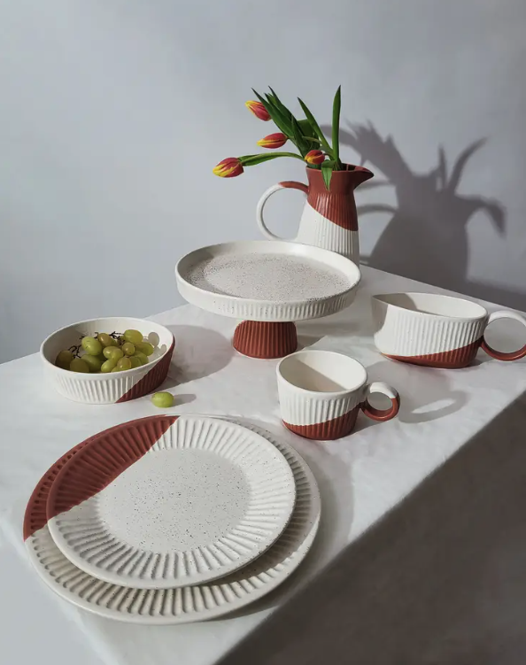 • Conjunto de loiça branca e terracota com textura estriada e manchas, disposição elegante com flores e uvas.