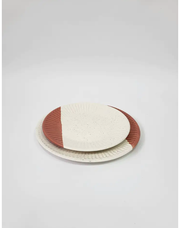 Prato de sobremesa pintado à mão, em faiança, com pormenor de linhas com relevo e detalhe terracota.