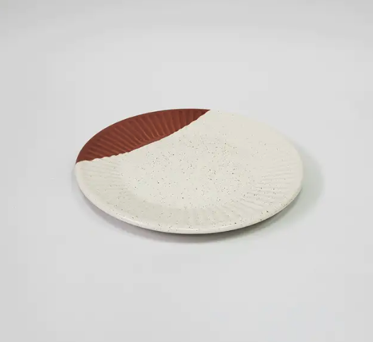 • Prato cerâmico redondo castanho e creme com padrão texturizado